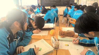 3年生は明日で通常授業は終わりです。互いに大きな声で声援を送りながら最後の授業に取組んでいました。