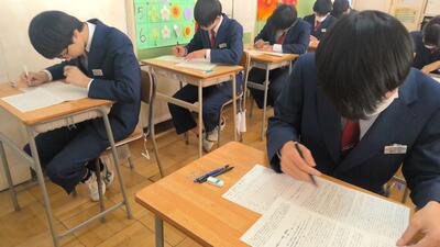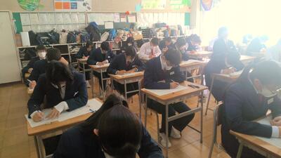 2日目は、社会、理科、英語を受けています。3年生は昨日県公立入試の学力検査がありました。本日は面接・実技検査を受けています。