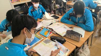 基本的な地名や河川や山地などの確認を教科書、プリント、地図帳を使い学習していました。活用する資料が豊富なのも社会科の特徴です。資料の活用力も学力の大きな一部です。