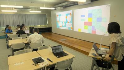 まず、業者の内田洋行さんに来校してもらい、PC室の後にできた「フーチャールーム」の使用法について研修しました。