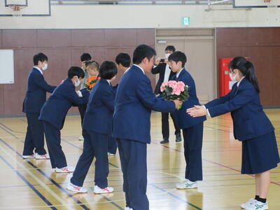 体育館で、歓迎の鉢花贈呈や、