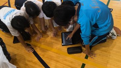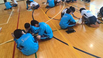 事前訪問に向けて体育館で行き方を調べたり、活動を確認したりしました。