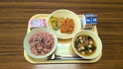【今日の献立】牛乳、たけのこごはん、あじの黒酢風味、浅漬け、フルーツミックス