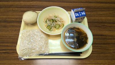 【今日の給食】牛乳、ごはん、マーボーなす、ビーフンと野菜の炒め物