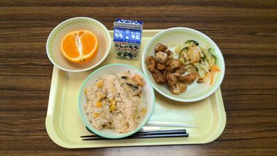 ※ピラフに入ったぷりぷりのエビ美味しかったです。ふわっかり揚げも生徒の人気メニューの一つです。今日の清見柑は大きくてとってもジューシーでした。
