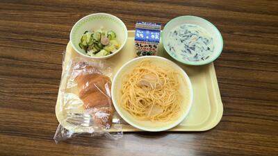 【今日の給食】牛乳、バターロール、和風しゃくし菜スパゲッティ、もやしのサラダ