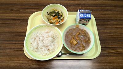 牛乳、カレーライス(麦ごはん)、小松菜の香味炒め